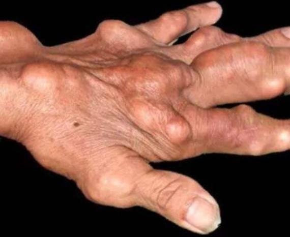 皮下痛风石和慢性痛风石性关节炎是长期显着的高尿酸血症,大量单钠尿酸盐晶体沉积于皮下、关节滑膜、软骨、骨质及关节周围软组织的结果。皮下痛风石发生的典型部位是耳郭,也常见于反复发作的关节周围及鹰嘴、跟腱和髌骨滑囊等部位。外观为皮下隆起的大小不一的黄白色赘生物,皮肤表面菲薄,破溃后排出白色粉状或糊状物,经久不愈。皮下痛风石常与慢性痛风石性关节炎并存。关节内大量沉积的痛风石可造成关节骨质破坏、关节周围组织纤维化和继发退行性改变等。临床表现为持续关节肿痛、压痛、畸形及功能障碍。慢性期症状相对缓和,但也可有急性发作。