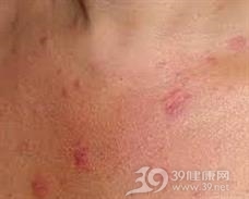 3.湿疹型 皮肤潮红、肿胀,表面可见密集的针头至米粒大小丘疹、水疱、糜烂、结痂及脱屑,似湿疹样外观,有时呈苔藓样变,自觉剧痒。本型少见。