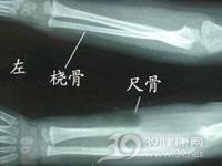 2、X线摄片:尺桡骨上端融为一起,其中间无皮质骨,桡骨小头与尺骨融合或桡骨小头完全缺如;或桡骨小头向后脱位,近端与尺骨干上部融合。